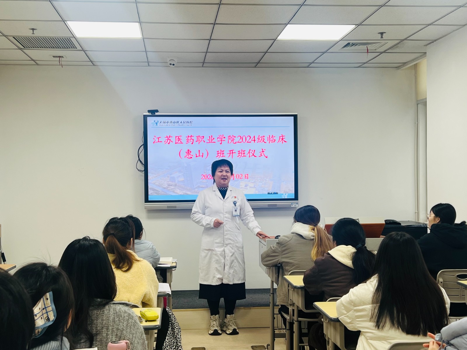 我院副院长徐太静首先致辞:对我院做了一个简短的介绍,指出我院是一所“医教研”综合性三级医院,对于教研工作一直非常重视,医院设置有专门的教学管理部门,有内、外、妇、儿多名理论授课和实习带教经验丰富的高级职称兼职教师;同时给临床班配备专职班主任和干净整洁的学习和住宿场所。对于江苏医药职业学院22位同学选择惠山临床学院,给予肯定和鼓励。她在开班仪式上提出要求和期望:要求同学们在惠山点的一年半时间里练好内功、提升修养、增强本领、不要落伍、不要掉队,早日成长为一名合格的医务工作者。让自己的青春之花,绽放出最美丽的色彩。