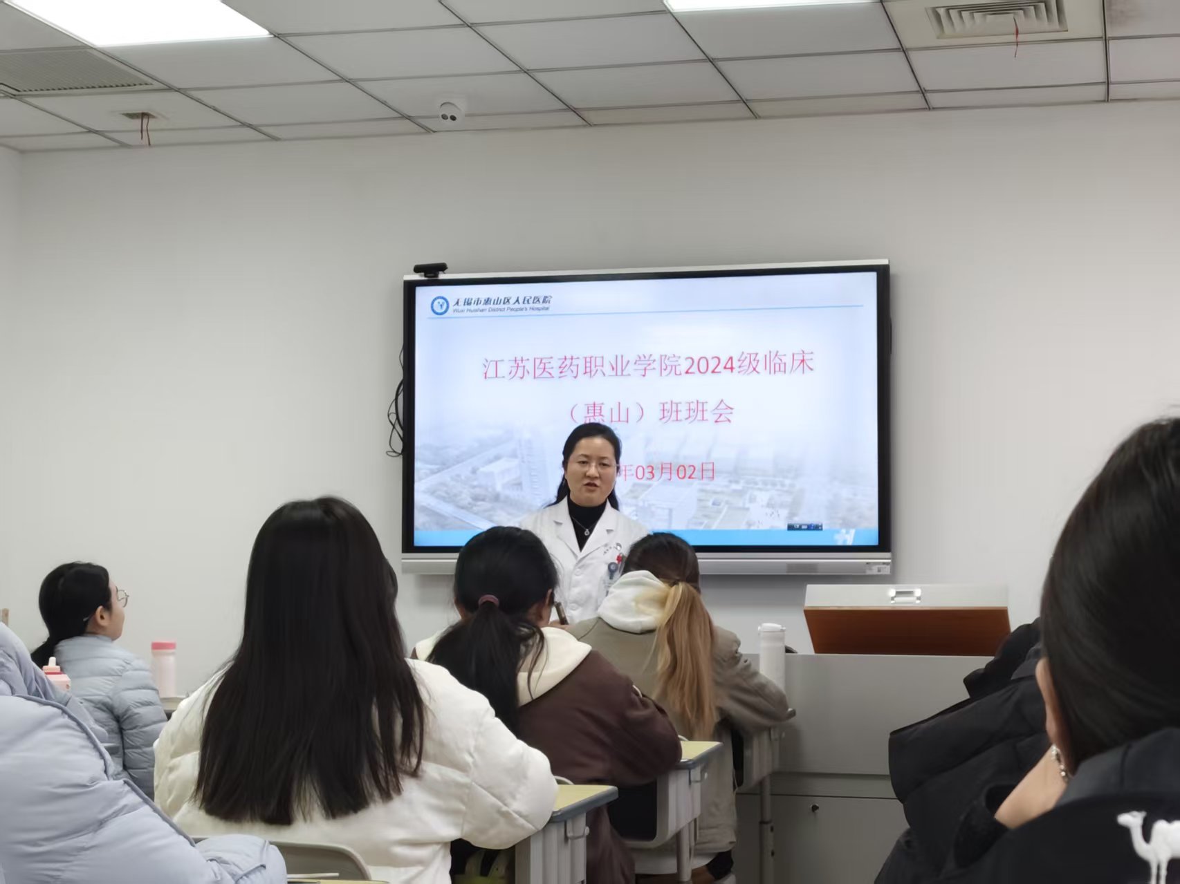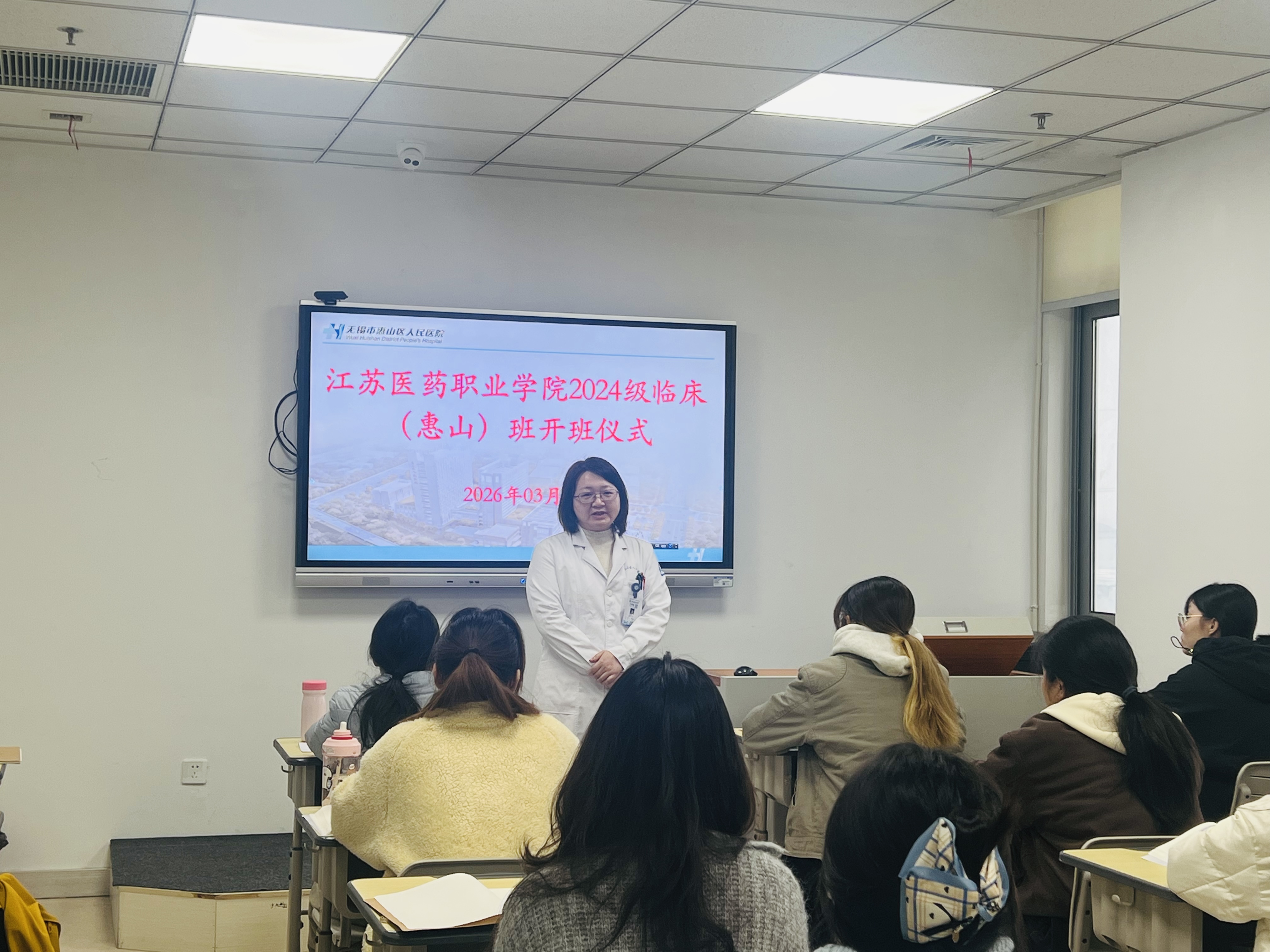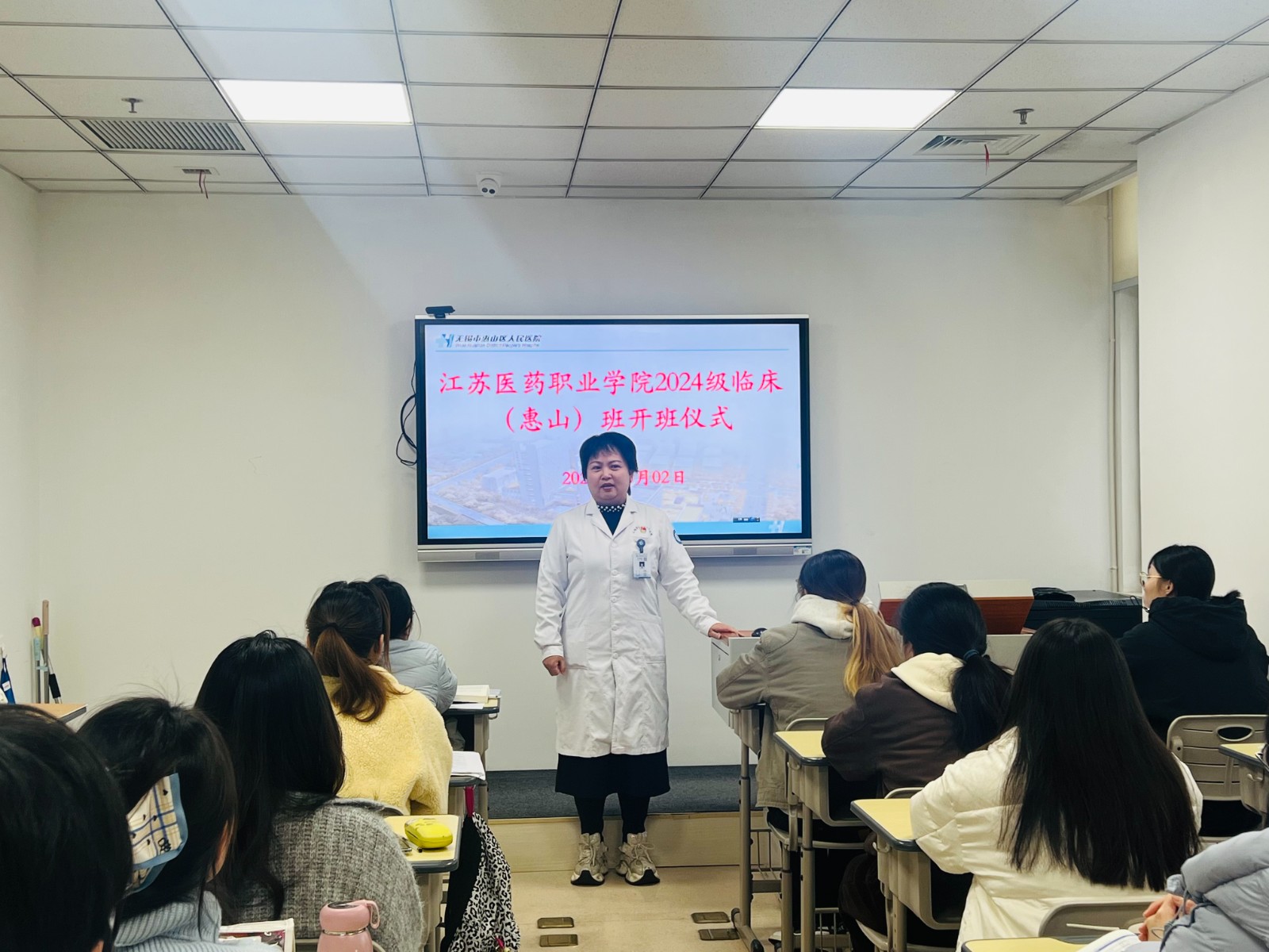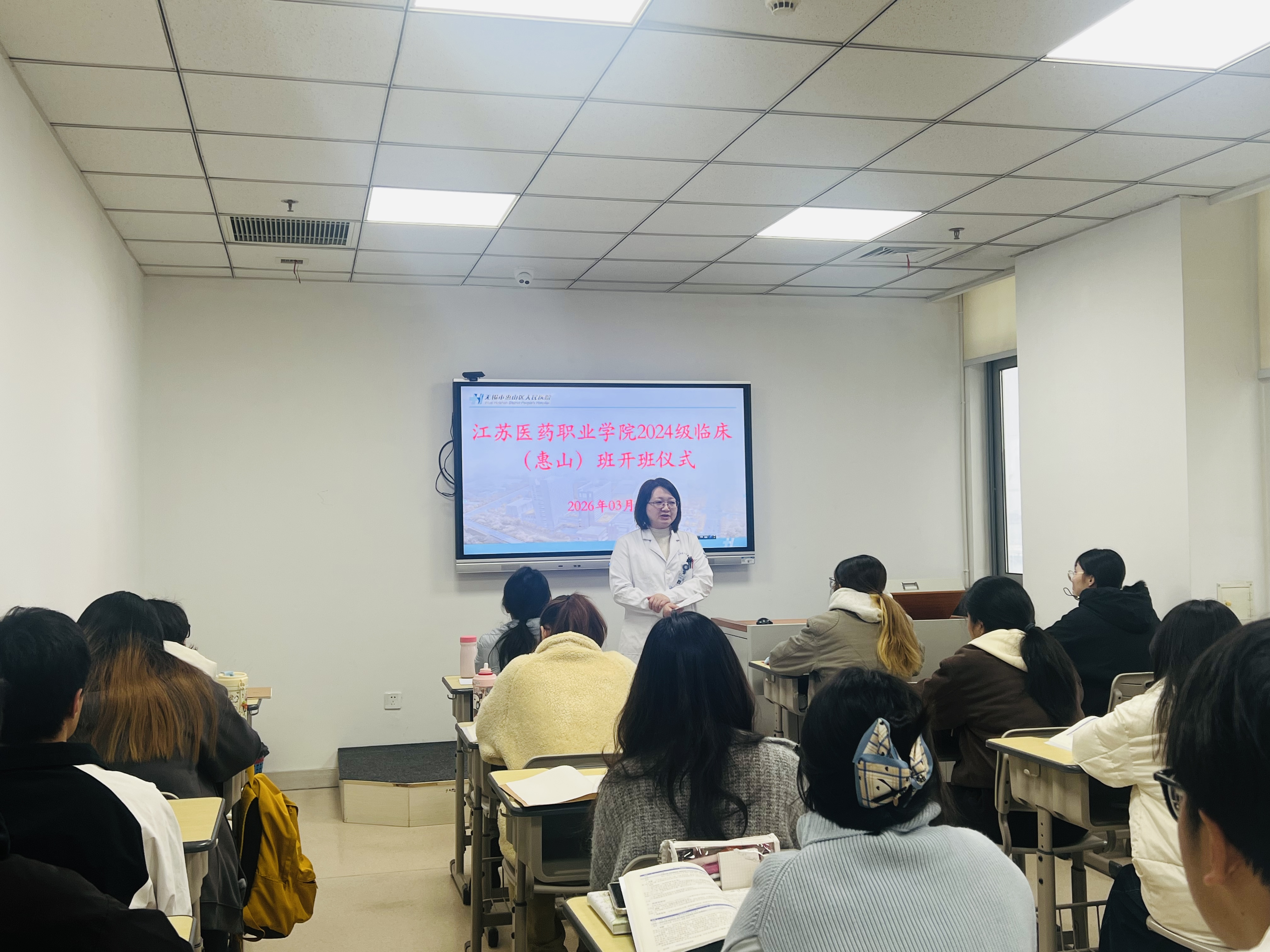 今日上午08:00,江苏医药职业学院惠山临床学院2024级临床“惠山班”开班仪式在我院3号楼6楼临床教学部举行。江苏医药职业学院医学院临床综合教研室主任王宏伟老师、我院副院长徐太静、科教部科长杨瑞瑞、团总支书记李烨、院感科老师蒙克那思、保卫科老师陈陆星钱出席仪式,24级临床惠山班22位同学参加仪式,开班仪式由24级临床班班主任刘瑛老师主持。