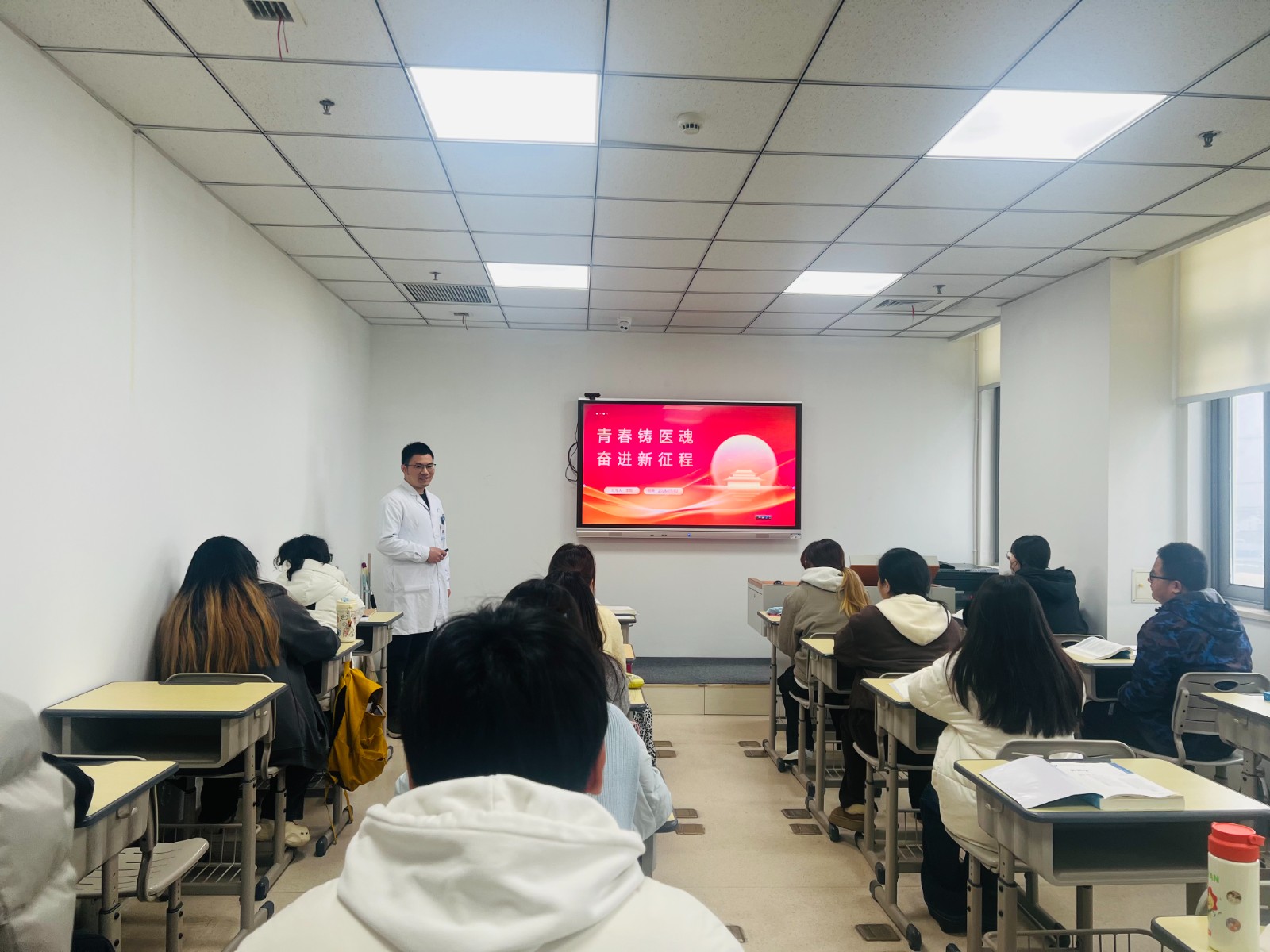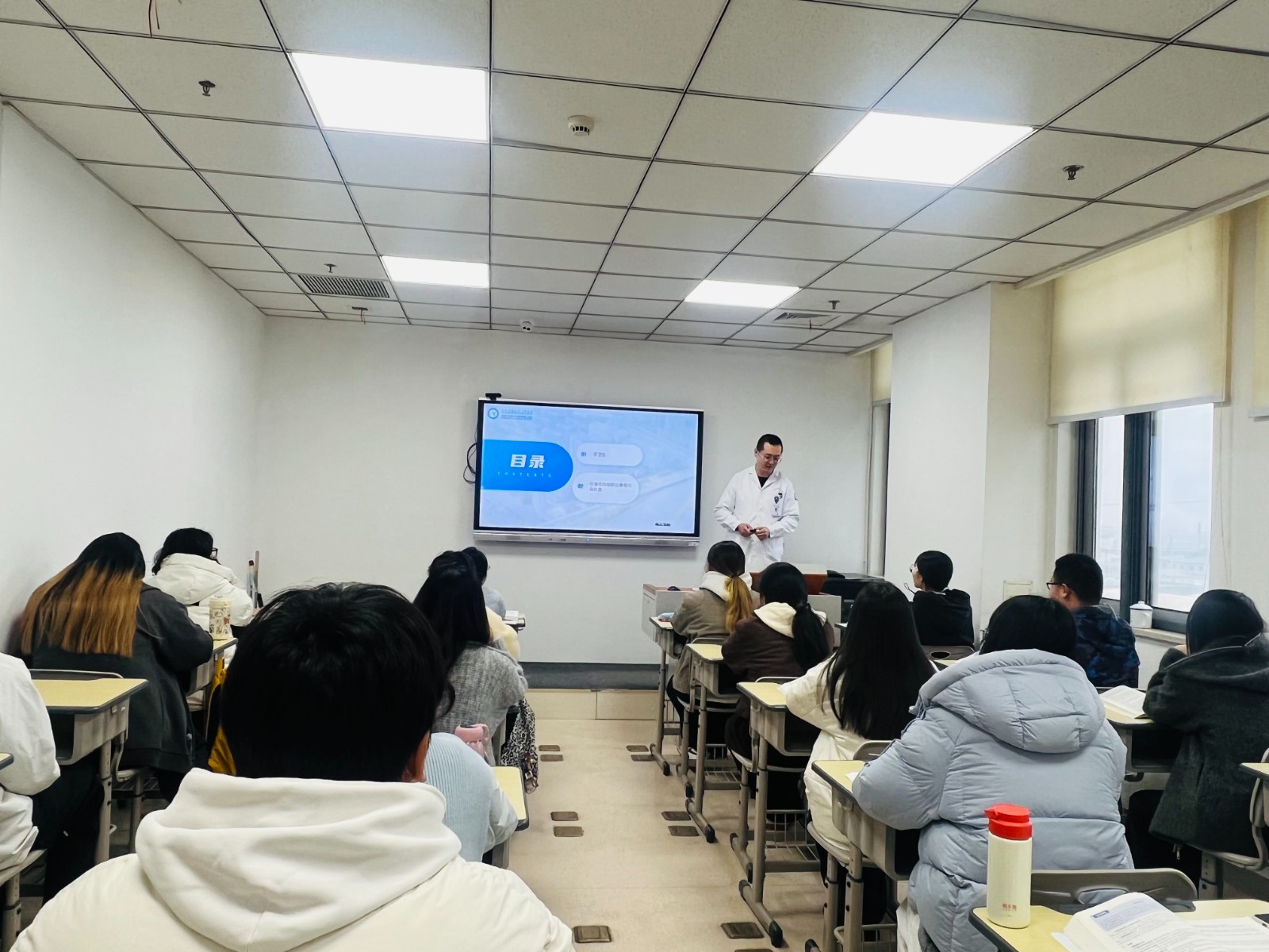 科教部杨瑞瑞科长对临床班学生进行健康教育。欢迎也感谢22位临床班同学选择“惠医”,同时送给同学三个词:一、归零:把假期的放松感归零,把在学校里背书的思维归零。在这里,面对的是活生生的病人,问诊不是背书,而是要解决问题。二、主动:不要等着老师来喂知识。老师欣赏的是那种追着老师问“为什么”,甚至敢质疑“这么做有没有更好方法”的学生。三、敬畏:敬畏生命,也敬畏规矩。穿上白大褂,大家的一言一行都代表着这家医院。希望大家在接下来的日子里学得好,吃得好,考的好,夯技能,攒底气,科教部永远做好大家的后盾。
