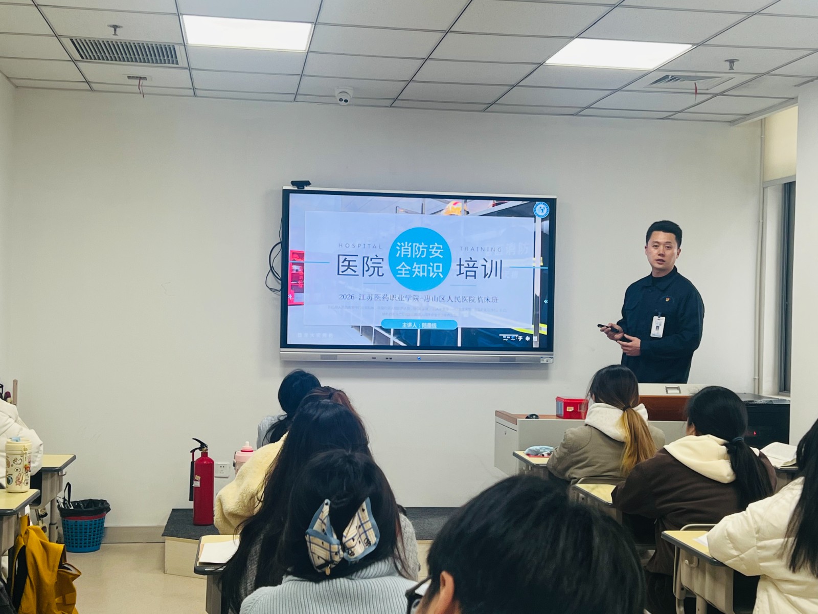 团总支书记李烨、院感科蒙克那思老师、保卫科陆星钱老师分别为22位同学进行医院团建活动教育、院感知识、手卫生、职业防护和消防安全知识培训、演练。